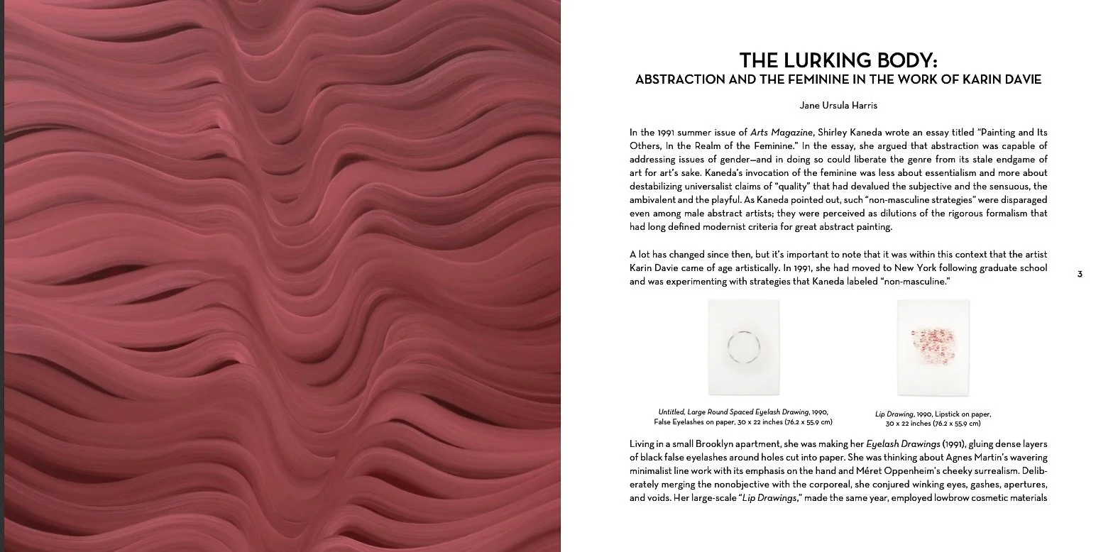 "Davie is best known for her iconic large-scale stripey wave and coil paintings that undulate, bulge and recede. Their trippy sense of animated movement gives them a living, breathing presence. It’s as if a current courses through them, pushing out at viewers and sucking us in. These embodied sensations recall the artist’s own movements in making the work; a structuring tool that engenders not just form but emotion and idea. It’s this incursion into the space of the observer that reveals Davie’s subversive use of the stripe as a catalyst for more than just optical tricks." https://www.milesmcenery.com/publications/karin-davie